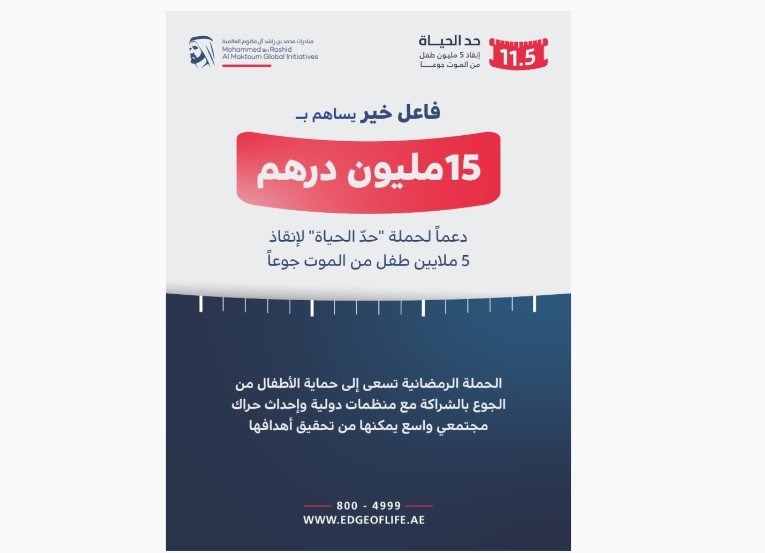 ساهم فاعل خير بمبلغ 15 مليون درهم في حملة “حد الحياة” لإنقاذ 5 ملايين طفل من الموت جوعاً، والتي أطلقها صاحب السمو الشيخ محمد بن راشد آل مكتوم نائب رئيس الدولة، رئيس مجلس الوزراء حاكم دبي “رعاه الله، بالتزامن مع شهر رمضان الكريم، لجمع مليار درهم على الأقل يتم استثمارها في مكافحة جوع الأطفال في العالم.