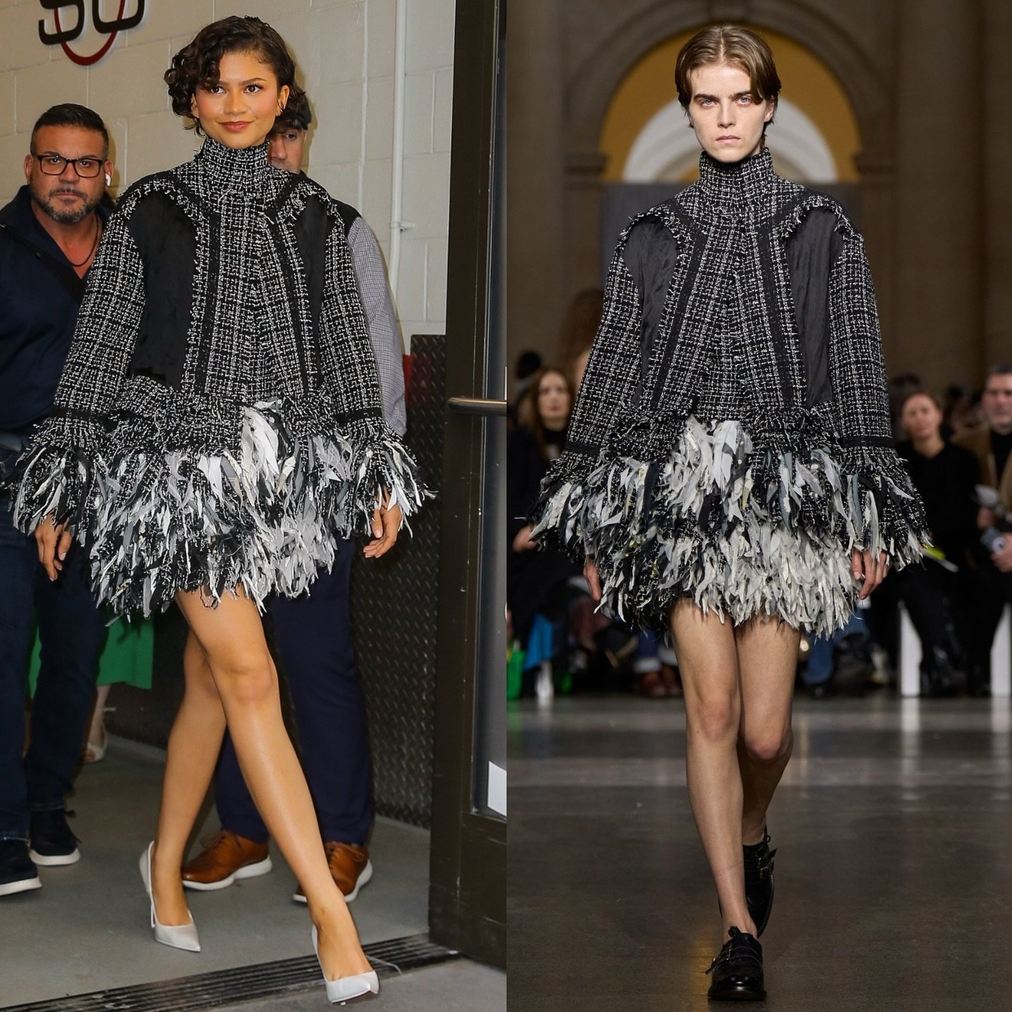 أما في إطلالة أخرى من Erdem، فقد اعتمدت تنورة قصيرة مزيّنة بالريش مع سترة تويد أنيقة.