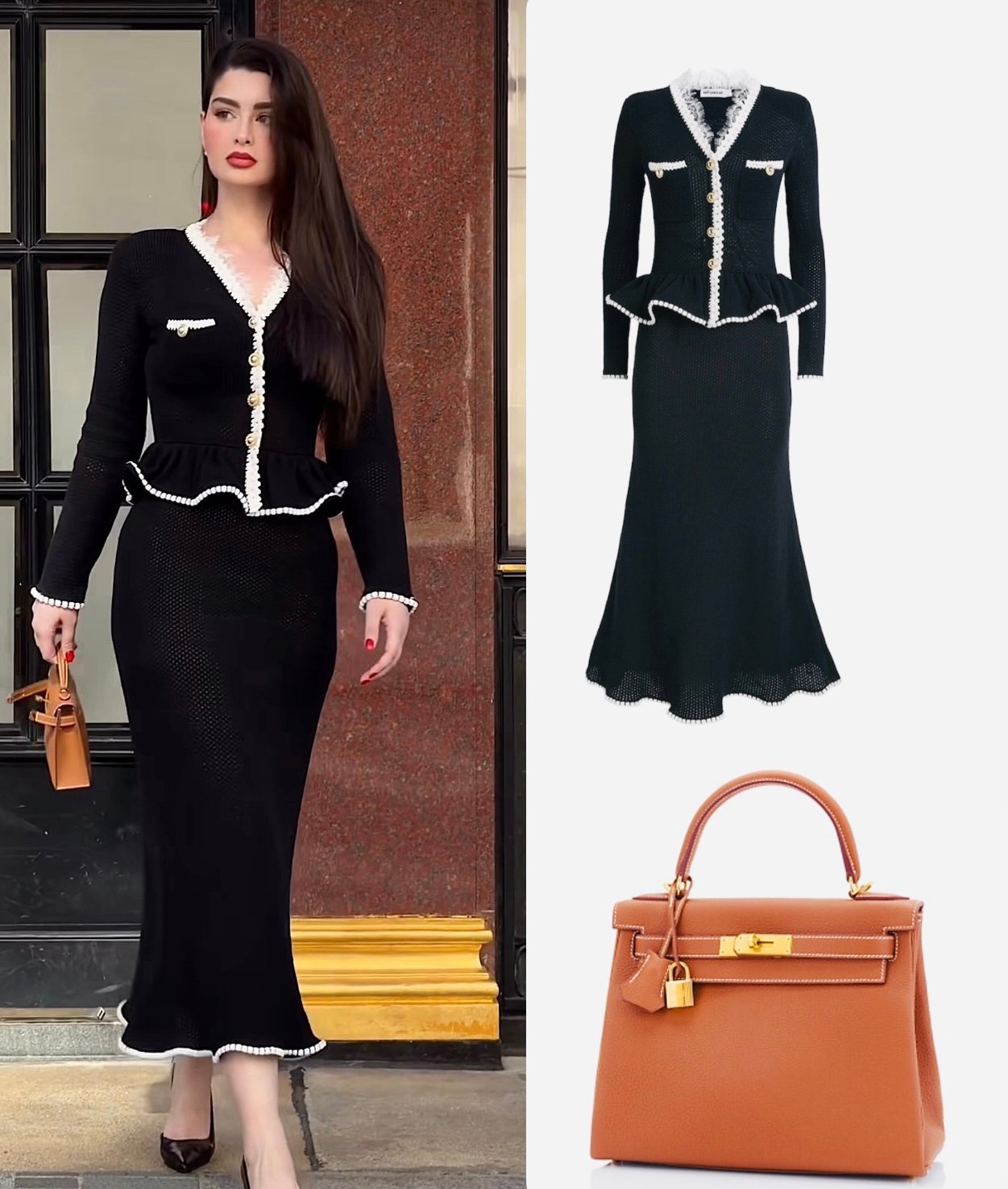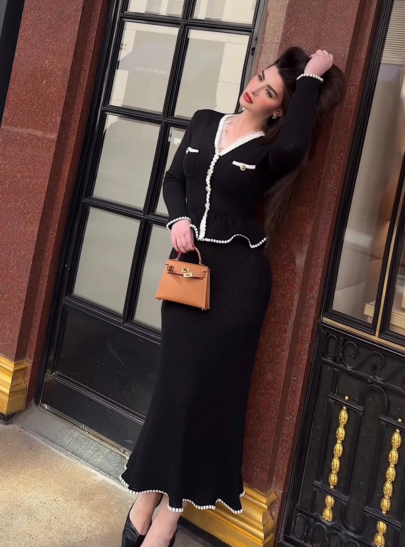 ولإكمال الإطلالة، نسّقت روان حذاءً أسود مدبّبًا مع حقيبة جلدية فاخرة بلون Camel من Hermès.