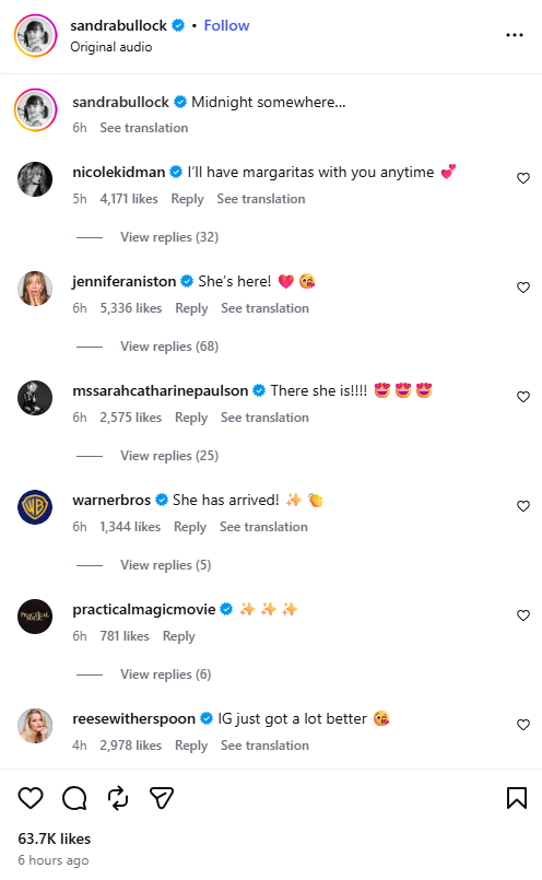 وعلّقت على الفيديو بعبارة: “منتصف الليل في مكان ما…”، في إشارة إلى فيلمها الشهير Practical Magic الصادر عام 1998.