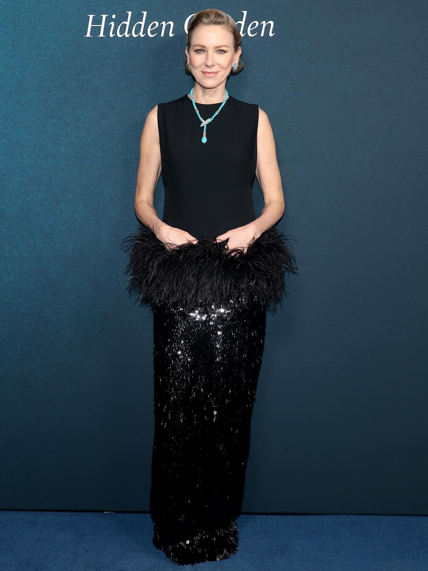 في المقابل، اختارت نعومي واتس فستاناً أسود أنيقاً من Taller Marmo، مزداناً بتطريزات برّاقة وريش عند الخصر.
